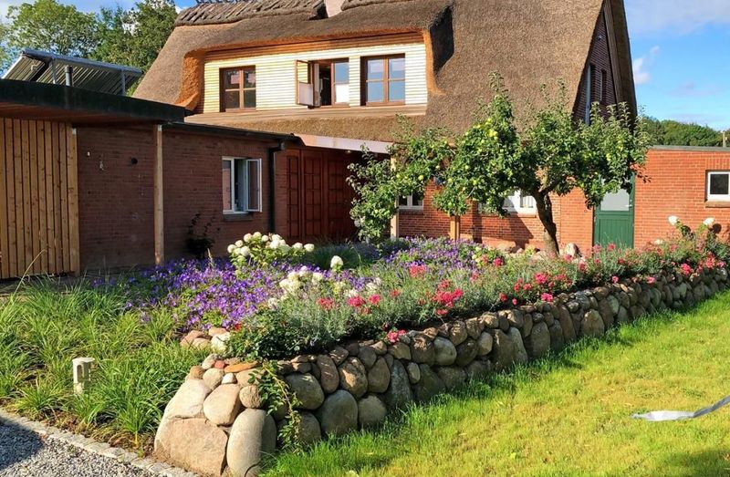 Der Vorgarten wird von einer Feldsteinmauer eingefasst auf der Rosen und Lavendel blühen. Hinter den Gebäuden wird das Grundstück durch Rhododendren gesäumt.